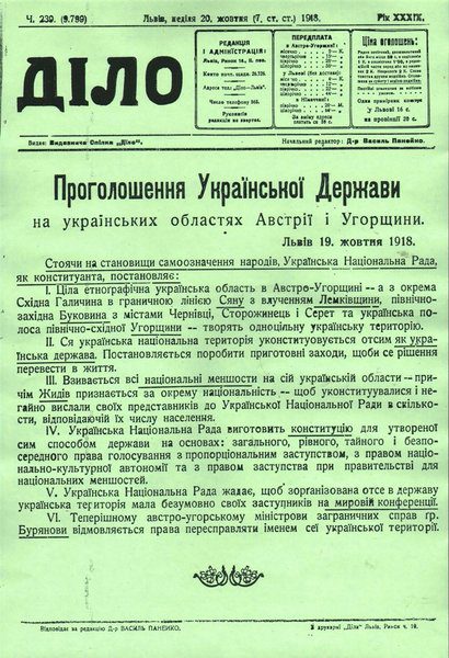 У Львові 18 жовтня 1918 року Українська парламентська репрезентація скликає збори всіх українських послів австрійського парламенту, сеймів Галичини та Буковини, політичних партій, духовенства та студентства цих областей. Українську Національну Раду обрали як політичну делегацію українського народу в Австро-Угорщині на зборах. 19 жовтня Євген Петрушевич, президент Української Ради, проголошує заснування Української Держави на зборах українських нотаблів (мужів довір’я).